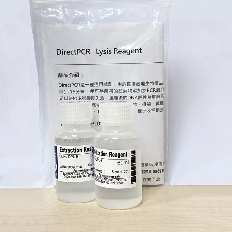 DirectPCR是一種通用試劑,用於直接處理生物樣品,無須分離DNA,過程簡單,僅需將樣品浸泡於試劑中1~15分鐘,便可將所得的裂解物添加於PCR混合物中,並擴增所選的DNA片段。試劑中所含的成分足以使PCR抑制劑失活,處理後的DNA變性為單鍊形式,並將RNA、蛋白質變性及水解,確保PCR反應能穩定進行。適合處理的樣品,包括動物、植物、真菌、酵母、細菌、病毒、血液、血清和血漿、唾液、口腔拭子、血卡、毛髮、羽毛、葉子、種子及福爾馬林固定的組織。