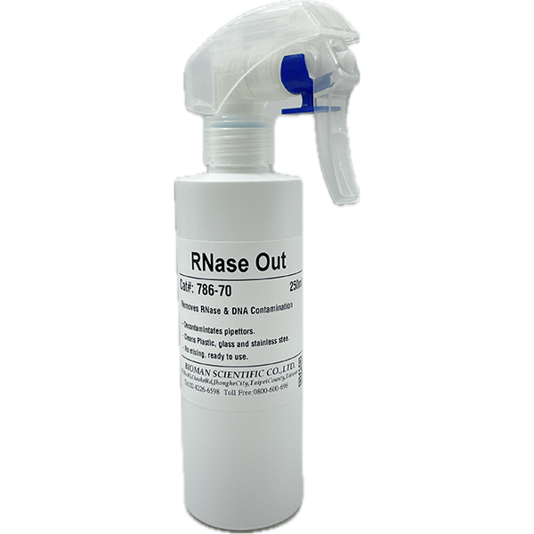 RNase Out可有效去除玻璃、塑膠等器皿表面之汙染源,且不影響後續操作所得之 DNA 及 RNA 樣品。